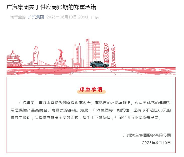 来源:广汽集团公众号广汽集团6月10日发布关于供应商账期的郑重承诺。广汽集团一直以来坚持为顾客提供高安全、高品质的产品与服务。供应链体系的健康发展是保障产品高安全、高品质的基础。为此,广汽集团将一如既往,坚持以不超过60天的供应商账期,保障供应链资金高效周转,携手上下游伙伴,共同促进行业高质量发展。