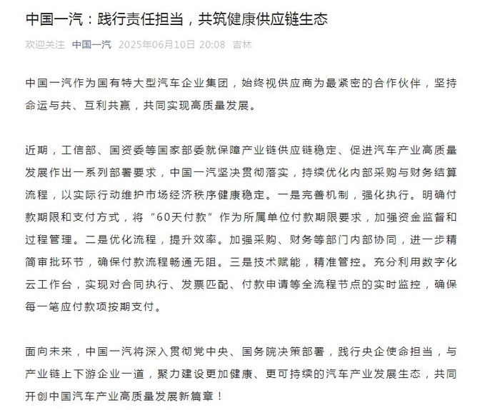 中国一汽表示,近期,工信部、国资委等国家部委就保障产业链供应链稳定、促进汽车产业高质量发展作出一系列部署要求,中国一汽坚决贯彻落实,持续优化内部采购与财务结算流程,以实际行动维护市场经济秩序健康稳定。一是完善机制,强化执行。明确付款期限和支付方式,将“60天付款”作为所属单位付款期限要求,加强资金监督和过程管理。二是优化流程,提升效率。加强采购、财务等部门内部协同,进一步精简审批环节,确保付款流程畅通无阻。三是技术赋能,精准管控。充分利用数字化云工作台,实现对合同执行、发票匹配、付款申请等全流程节点的实时监控,确保每一笔应付款项按期支付。