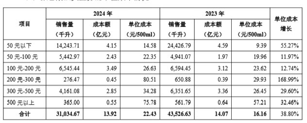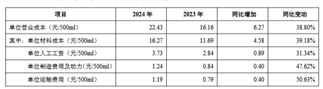 (4)报告期酒类业务的单位成本明细情况。2024年平均成本受材料价格、生产量及销售订单量的影响,导致单位成本较同期增长38.80%。