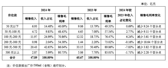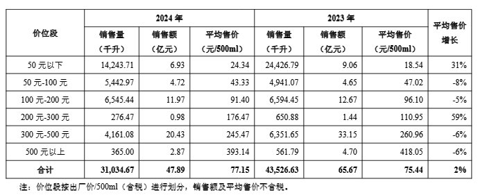 (2)销售价格的变化情况。公司酒类产品平均售价同比增长2%,其中出厂价50元以下系列酒平均售价增长31%,主要是公司的区域性定制产品外包装材料以前由经销商自行采购,2024年调整为由公司采购,其采购金额加价到产品售价中,所以导致平均售价较同期有所增长。200元-300元价位段产品售价增长主要是该价位段中产品销售结构的变化影响(2023年主要销售品种沱牌曲酒(中国名酒纪念版)的出厂价较低;2024年主要销售品种品味大师晏、桐酱•同德的出厂价相对较高)。其余价位段系列产品平均售价均有所下降,主要是2024年,由于行业竞争加剧、经销商库存加大等原因,为帮助经销商消化社会库存,形成良性循环,所以在销售折扣方面针对不同的产品增加了3%-5%的销售折让,增加部分主要用于帮助客户消化库存。