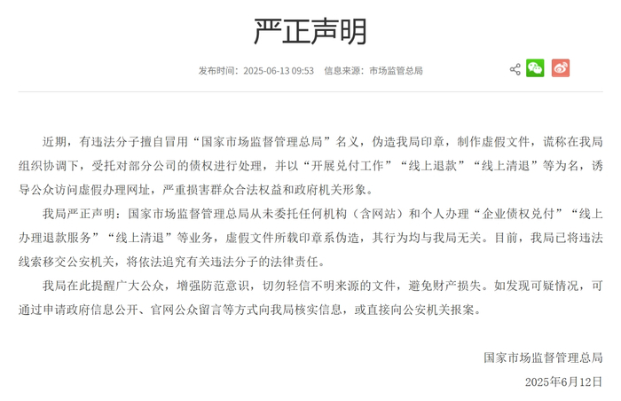 声明称,国家市场监督管理总局从未委托任何机构(含网站)和个人办理“企业债权兑付”“线上办理退款服务”“线上清退”等业务,虚假文件所载印章系伪造,其行为均与我局无关。目前,我局已将违法线索移交公安机关,将依法追究有关违法分子的法律责任。