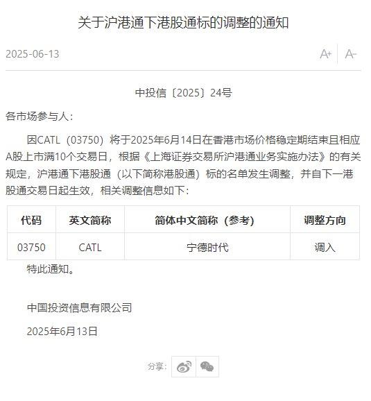 【上交所:宁德时代H股调入港股通标的名单】上交所13日公告称,宁德时代H股调入沪港通下港股通标的名单,并自下一港股通交易日起生效。(中新经纬APP)