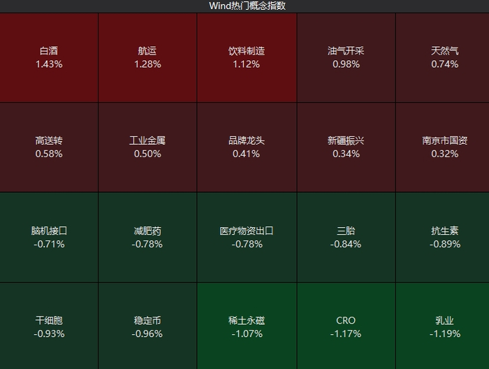 盘面上,白酒、航运等板块涨幅居前,创新药概念股持续回落。