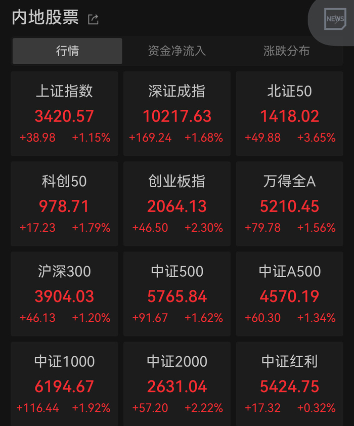 Wind截图截至收盘,沪指放量收涨1.15%收复3400点,深成指涨1.68%,创业板指涨2.3%,北证50指数涨3.65%。