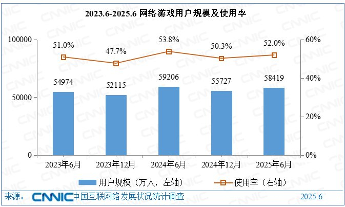 《报告》指出,截至2025年6月,我国网络游戏用户规模达5.84亿人,较2024年12月增长2692万人,占网民整体的52.0%。