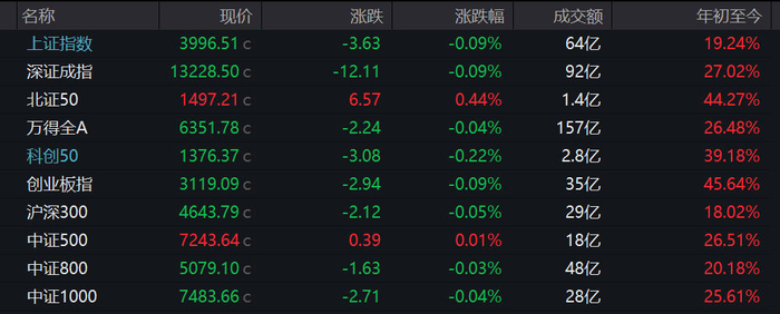 中新经纬11月13日电 13日,A股三大指数集体低开,上证指数跌0.09%,报3996.51点;深证成指跌0.09%,报13228.50点;创业板指跌0.09%,报3119.09点。