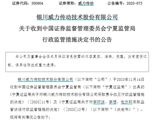 宁夏证监局决定对威力传动采取责令改正的行政监管措施,并记入证券期货市场诚信档案。