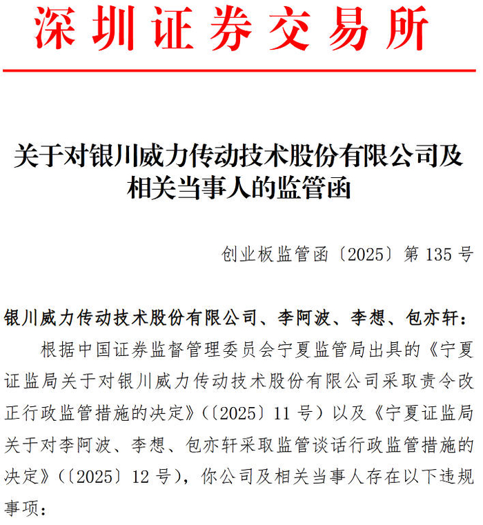 经查,威力传动存在信息披露不完整的问题,宁夏证监局已对威力传动采取责令改正的行政监管措施(宁证监行政监管措施决定书〔2025〕11号)。时任董事长李阿波、总经理李想、董事会秘书包亦轩对上述问题负有主要责任。根据相关规定,宁夏证监局决定对李阿波、李想、包亦轩采取监管谈话的行政监管措施,并记入证券期货市场诚信档案。