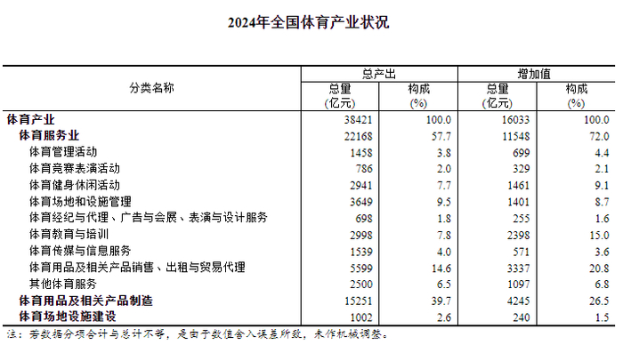 从内部构成看,2024年体育服务业增加值为11548亿元,占体育产业增加值的比重为72.0%,比上年下降0.7个百分点。体育用品及相关产品制造增加值为4245亿元,占体育产业增加值的比重为26.5%,比上年提高0.8个百分点。体育场地设施建设增加值为240亿元,占体育产业增加值的比重为1.5%,比上年下降0.1个百分点。