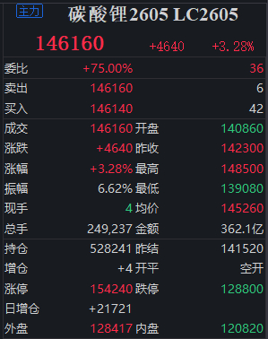同花顺iFinD截图【碳酸锂主力合约涨超3%】截至发稿时,广期所碳酸锂主力合约涨3.28%,报146160元/吨。(中新经纬APP)