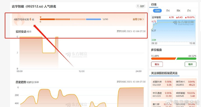 单从K线走势来看,达华智能若能维持现在走势,震荡攀升并突破第一个平台,其股价就具备了较大的想象空间。再加上,达华智能具有“华为产业链算力+华为+卫星通信+光电显示”4重概念,也在很大程度上吸引了市场的关注,甚至被部分股民称为,极具“妖气”。截至10月4日,达华智能在A股人气榜上排名第六。