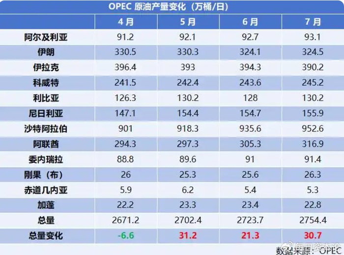 自2020年以来,以沙特、俄罗斯为首,包括伊拉克、阿联酋、科威特、哈萨克斯坦、阿尔及利亚和阿曼在内的8个主要OPEC+国家便实施了多轮减产。但自2025年4月起,主要产油国开始战略转向,截至目前已连续6个月作出增产决定。