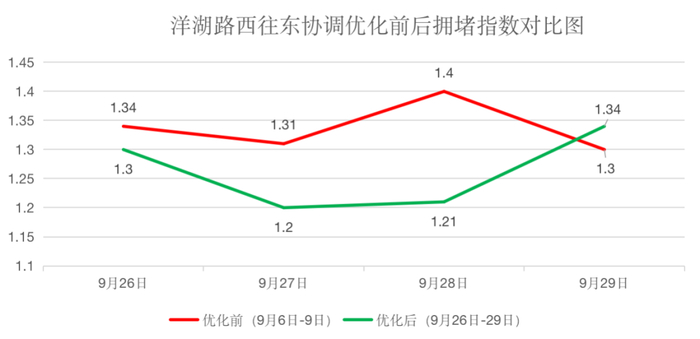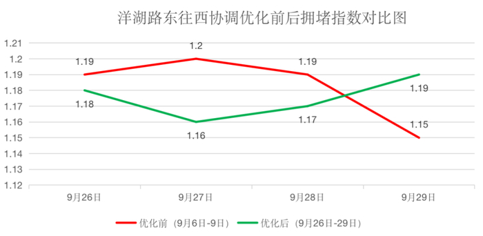 将洋湖路优化前(2021年9月6日至9日)与优化后(2021年9月26日至29日)进行全天拥堵指数对比,其中西往东方向拥堵指数最高下降13.6%,平均下降5.5%,东往西方向拥堵指数最高下降3.3%,平均下降0.6%。在对比时段内,9月26日至28日拥堵指数均为下降,29日由于降水天气影响,驾驶视野受阻,车辆行驶缓慢,通行速度下降,拥堵指数上升。