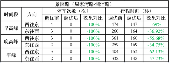 通过浮动车调研方式对比优化前后路段通行的行程时间和停车次数等变化情况。早高峰采用缓进策略,停车次数由2次增加至3次,行程时间增加25.89%。平峰及晚高峰双向停车次数由调优前2至3次不等减少为0次,行程时间平均减少35%,行车体验大幅提升。因该路段无明显行车干扰,车速较为离散,建议驾驶者使用推荐速度行驶,切勿超速行驶。