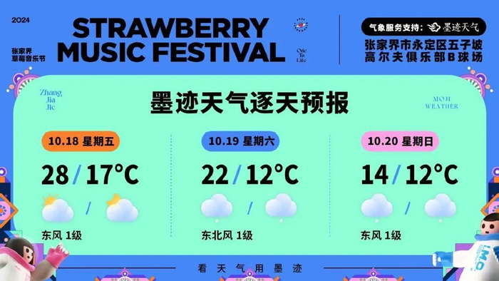 1号线:融山东路临时停车区上车,途经融山东路、澧兰西路,终点为张家界市民广场(华天酒店对面)2号线:融山东路临时停车区上车,途经融山东路、大庸路、迎宾路,终点为张家界站(火车南站)3号线:融山东路临时停车区上车,途经融山东路、大庸路、子午路,终点为大庸桥公园。—天气情况—音乐节举办期间,较前几日有明显降温,尤其是日间最高温降低,建议适当增添衣物。19日上午阴天为主,中午开始转阵雨/小雨天气;20日预计阴雨持续全天,紫外线强度低,出行需要携带雨具,避免涉水。空气湿度高,极易出现天气痛情况,有类似症状的朋友们需要提前预防。