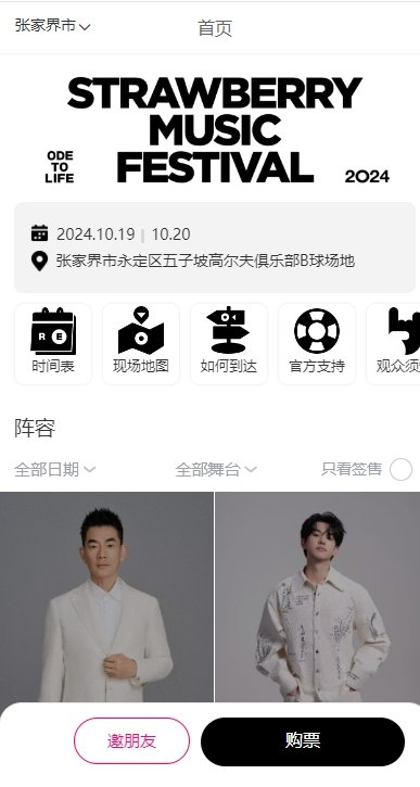 山与乐的交响,2024张家界草莓音乐节将于10月19-20日在永定区五子坡高尔夫俱乐部B球场举办,部分票种已售罄,部分平台的线上售票会在演出前截止,演出当天可通过大麦网进行线上购票,或在音乐节入口的官方售卖出现场购票,请选择从官方售票平台购票,从非官方售票平台购票产生的后果由个人承担,购票前请详细阅读票务页面的相关须知内容!