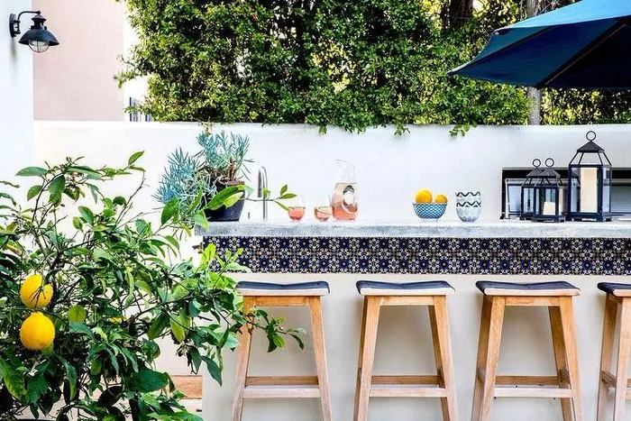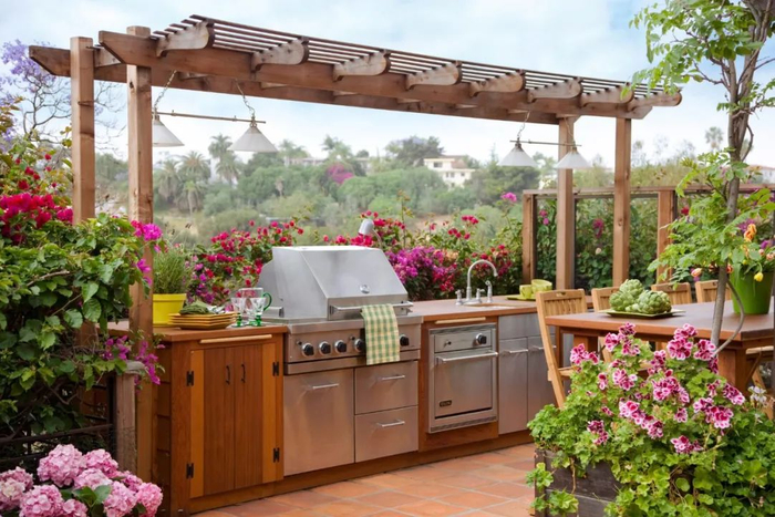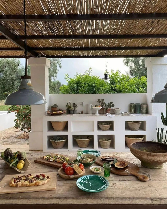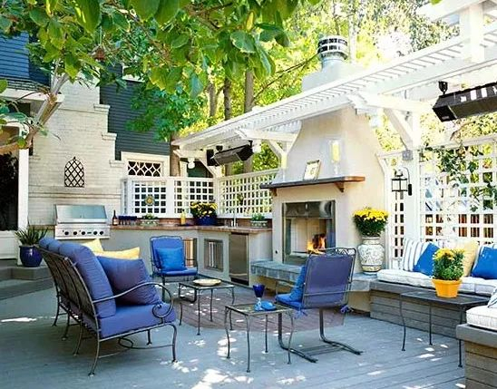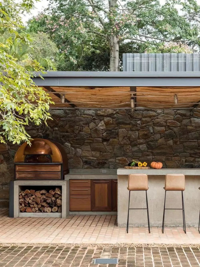 户外厨房形式多样,可以是简单的地面铺装+炊具,也可以是有着吧台的嵌入式户外厨房。