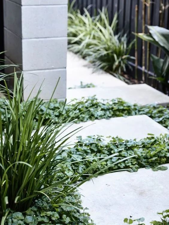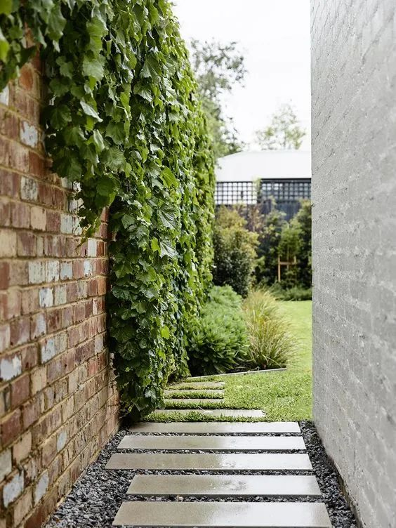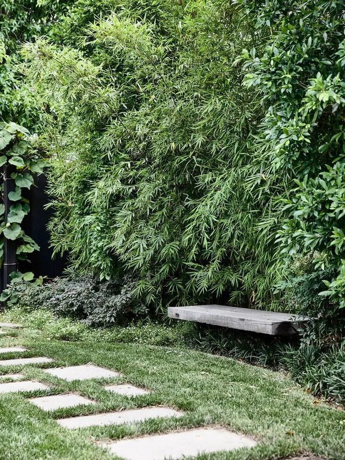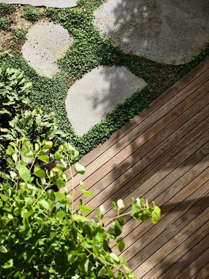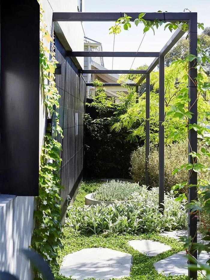 在狭长的空间中布置汀步,与草地自然的融为一体,整个空间看起来便不至于太拥挤。