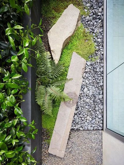 与沙砾结合的汀步,在形式上构成的变化和对比虽然不尽相同,但在色彩上却能很好地做到统一化。恍惚间,还有一种山水交融之感。使整个空间的搭配和谐自然。