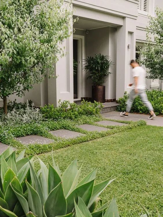而不规则的汀步也颇有设计感,让庭院的小道不再单调的同时也能保证草坪植被不被破坏,予人一种别样的自然体验。