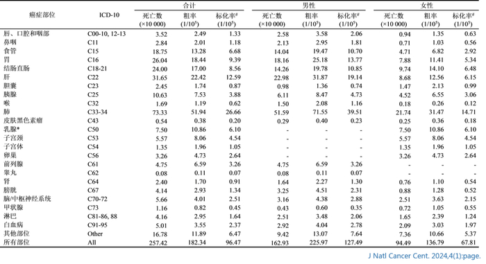 表2 2022年中国恶性肿瘤死亡情况估计