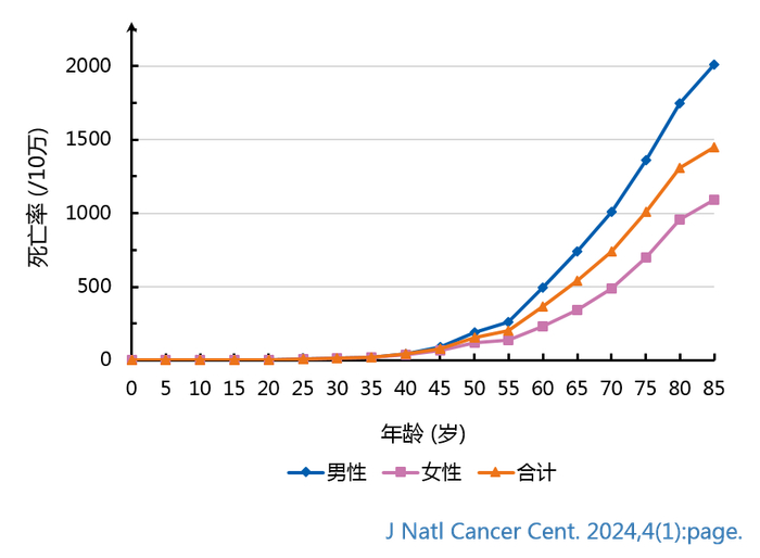 全癌种的死亡率在40-44岁年龄组后显著增加,并在85岁及以上年龄组达到峰值 。
