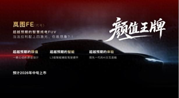 “岚图汽车”联合“华为乾崑”将在2026年中旬重磅推出“超越预期的智慧纯电FUV”,项目代号“岚图FE”。这一次,岚图直接“亮牌”:高颜值的设计美学,行业领先的四激光雷达感知系统,L3级智能辅助驾驶硬件,领先一代的AI交互智能座舱。