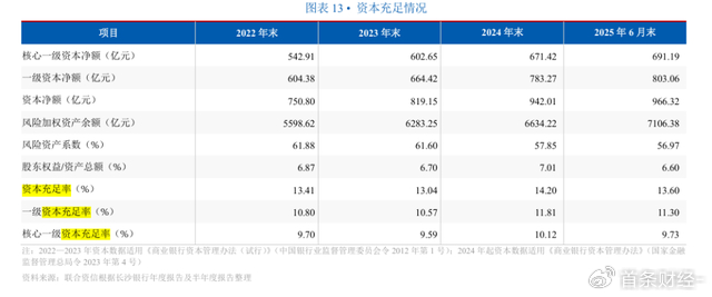 2023年-2024年,该行资本充足率为13.04%、14.2%;一级资本充足率10.57%、11.81%;核心一级资本充足率9.59%、10.12%。2025上半年末,资本充足率、一级资本充足率、核心一级资本充足率为13.6%、11.3%、9.73%,截止三季度末进一步提至14.23%、11.88%和10.24%。