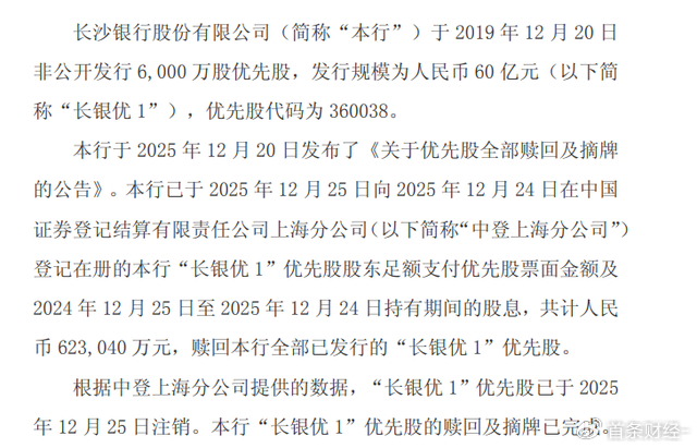 2025年12月26日晚,长沙银行公告称,于2019年12月20日非公开发行的6000万股优先股(发行规模60亿元,简称“长银优1”)已于2025年12月25日完成注销,累计支付票面金额及股息共计62.304亿元,并正式摘牌。