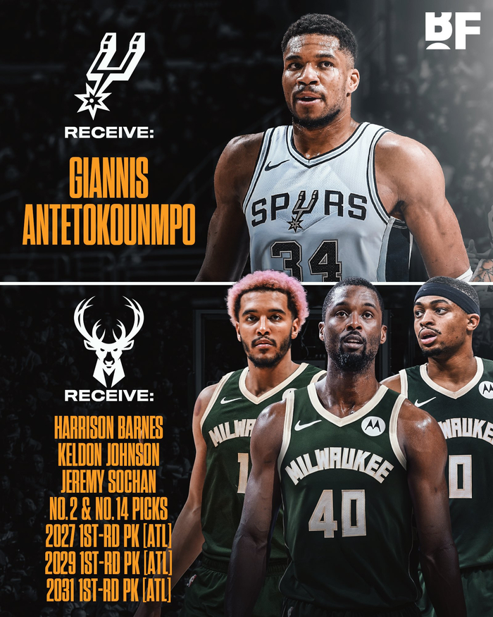 马刺用巴恩斯&凯尔登&索汉&5首轮(今年的榜眼签+14号签+27年、29年、31年首轮)梭哈字母哥。福克斯加字母加文班画面很美, 但是还得去自由市场找个3d代替巴恩斯 不然依旧走不远。马刺还是理性点,马刺的问题是外线防守和锋线防守,要交易也是找戴森丹尼尔斯和赫伯特琼斯那样的防守悍将,再找一个珀尔特尔那样的内线,这个付出代价小而且更有效
