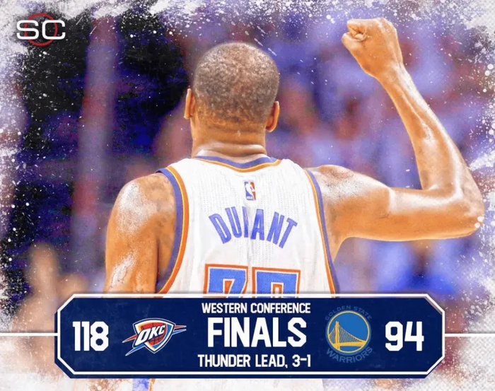 美媒BricksCenter发推:雷霆上一次在西决3-1领先是16年对阵勇士,最后他们遭遇勇士1-3惊天翻盘。