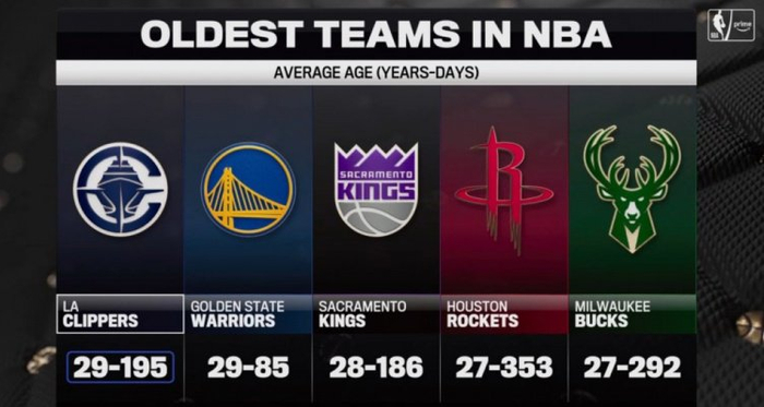 转播方晒出一组数据,本赛季联盟最老的5支球队平均年龄如下: