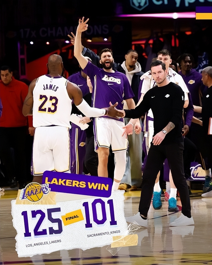 赛后湖人官方发布赢球海报,詹姆斯和主教练雷迪克击掌瞬间成为封面。