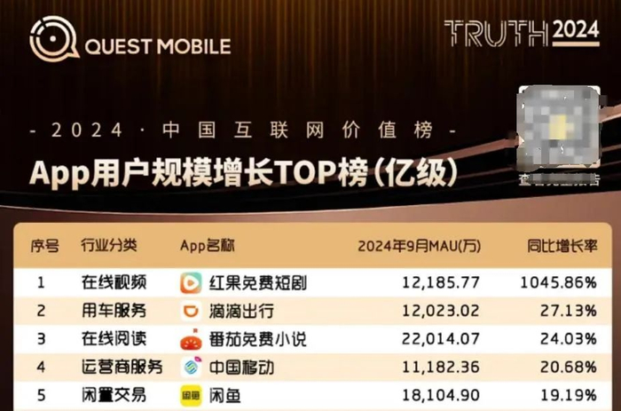 在三月底的视听大会上,红果短剧也主办了“千行百业入剧来:微短剧产业生态与艺术创新论坛”。《2024年中国互联网价值榜》显示,红果用户规模同比增长1045%,高居增长TOP榜(亿级)榜首,QuestMobile数据显示,2024年3月,红果月人均单日使用时长达1.38小时,月活用户0.54亿;同年9月,红果月活跃用户达到1.2亿,同比增长1045.86%,成为亿级APP中用户规模增长最快的应用;到了11月,红果月活1.4亿,呈现持续高速增长态势。