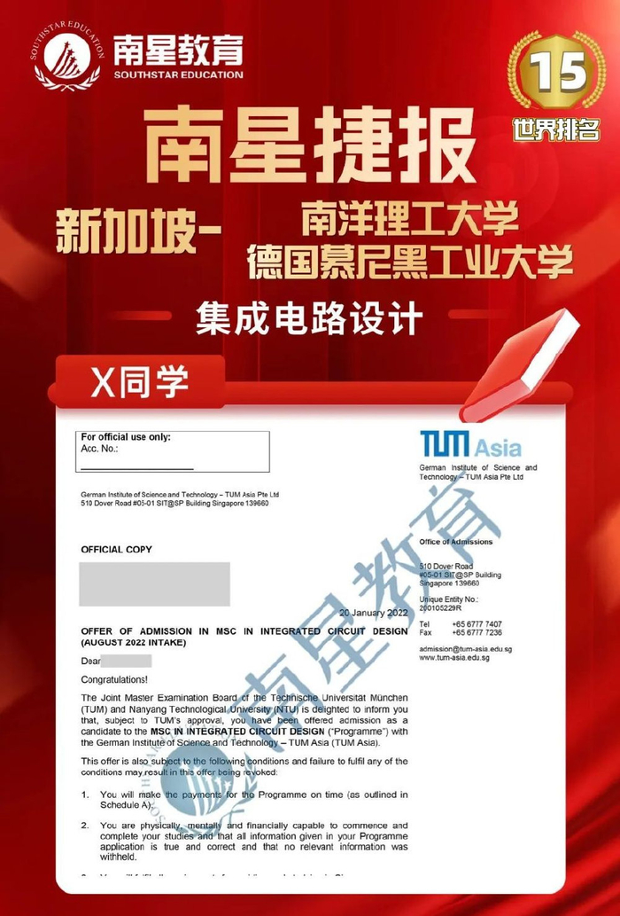当然,最终的结果是好的,在中国农历新年前顺利拿到了新加坡南洋理工大学与德国慕尼黑工业大学联办的集成电路设计理学硕士的录取,且用全英文授课证明豁免了雅思成绩。X同学心里的压力也彻底释放了,开开心心过了一个中国年。