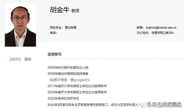 近日,有网友发帖称,南开大学物理科学学院胡金牛、陈璟两位教授的个人简介不仅真诚且十分幽默。其中,胡教授在个人简介中坦言,自己的部分学术论文曾发布在“水刊”“担任多个学术期刊审稿人(被人强拉进去的)”。研究方向方面,胡教授也介绍得风趣实在,有的方向“目前火得一塌糊涂,其实都是为了生存”。