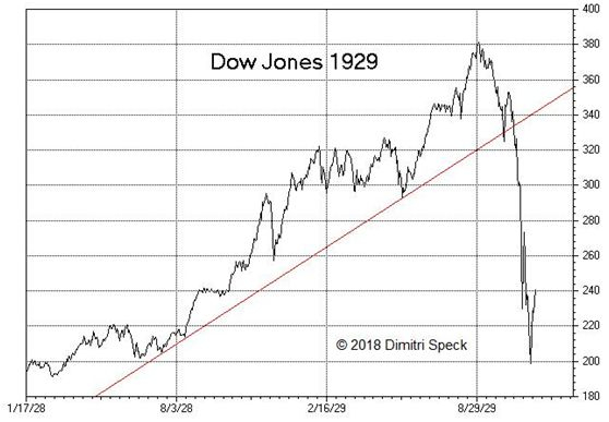 过度的膨胀及融资,最终招致了灾难。1929年道琼斯指数的最高点定格在9月3日的381点,到10月23日已经跌掉了20%,24日、25日连续恐慌性抛售,美国股市开始崩盘。