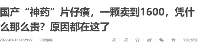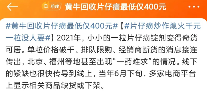然而,到今年下半年之后,9月30日一条“黄牛回收片仔癀最低仅400元”的消息冲上热搜,有网友就直言:“就是炒作”、“智商税!”、“10元左右的清开灵一样效果”……