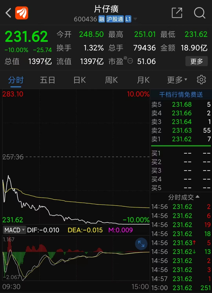 今天午后片仔癀的股价最终还是封死跌停,大跌10%,最新市值1397亿,较上周五收盘1552亿市值缩水155亿。