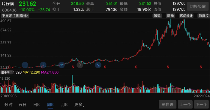 (片仔癀股价走势截图)可以看到,自2016年以来片仔癀的股价涨幅巨大,从最低24.87元一路涨到最高490.67元,最大上涨幅度高达1872.93%,最高市值一度达到2954.81亿,而同期片仔癀业绩仅从4.67亿增长到24.31亿,业绩涨幅只有4.2倍,估值显然过高。