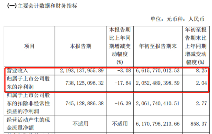 片仔癀三季报显示,第三季度营收21.93亿、同比下滑3.08%,实现归母净利润7.38亿、同比下滑17.64%,实现扣非净利润7.45亿、同比下滑16.39%;前三季度营收66.15亿、同比增长8.25%,实现归母净利润20.52亿、同比增长2.04%,实现归母净利润20.61亿、同比增长2.77%。
