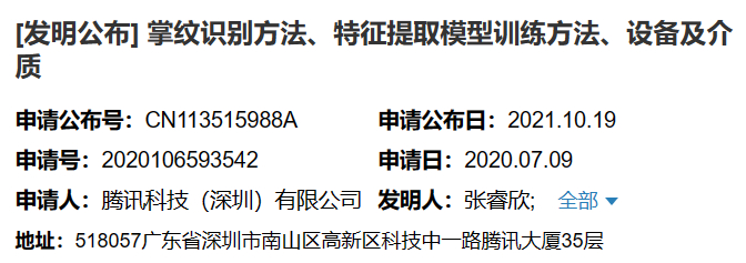 据腾讯提交的“掌纹识别方法、特征提取模型训练方法、设备及介质”专利显示,该方法包括获取目标手部图像、对目标手部图像进行特征提取获得掌纹、对多个预设掌纹特征进行识别处理确认目标用户。