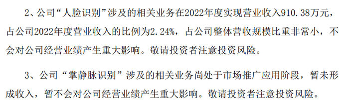 5月25日盘后,百盛智能发布严重异动公告称,公司“人脸识别”涉及的业务在2022年的营收为910.38万、占比2.24%,公司“掌静脉识别”涉及的业务尚处于市场推广应用阶段,暂未形成收入。
