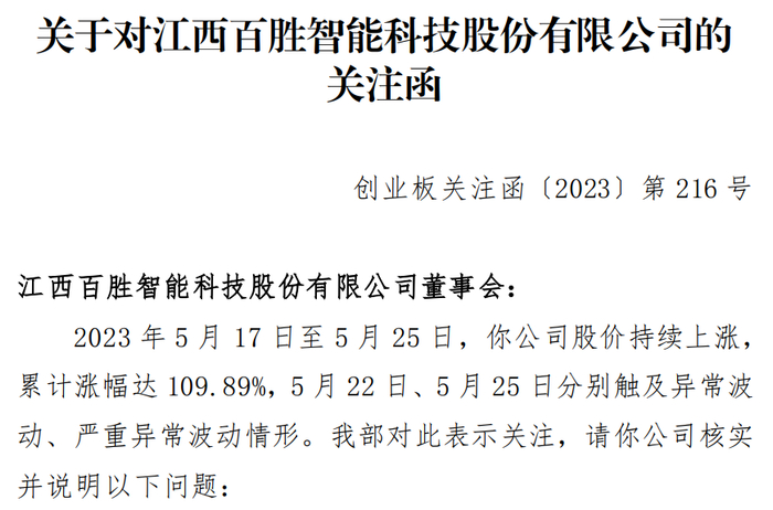 (百盛智能关注函截图)上市前高增长,上市后不增长