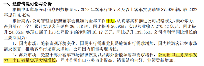 (宇通客车2023年财报截图)这份财报中主要指标均出现大幅增长,说明2023年宇通客车业务之强劲。而且,在这份强劲的财报中,宇通还表示,2024年公司收入计划为329亿元,进一步表明宇通对未来业务发展的信心。财报中公司还表示,受益于海外客车市场需求恢复以及海外新能源客车需求增长,公司出口业务持续发力,出口销量实现大幅增长,公司出口业务占比提高,业绩贡献增加。