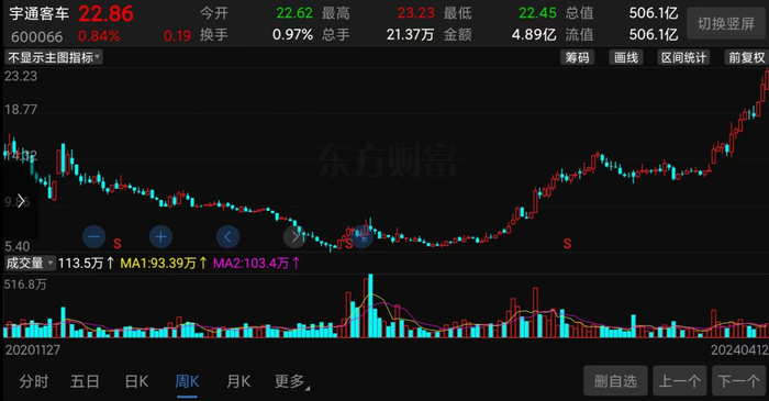 实际上,自2022年4月底以来,宇通客车的股价已经上涨超329%,而自今年年初以来上涨幅度已经超过83%。