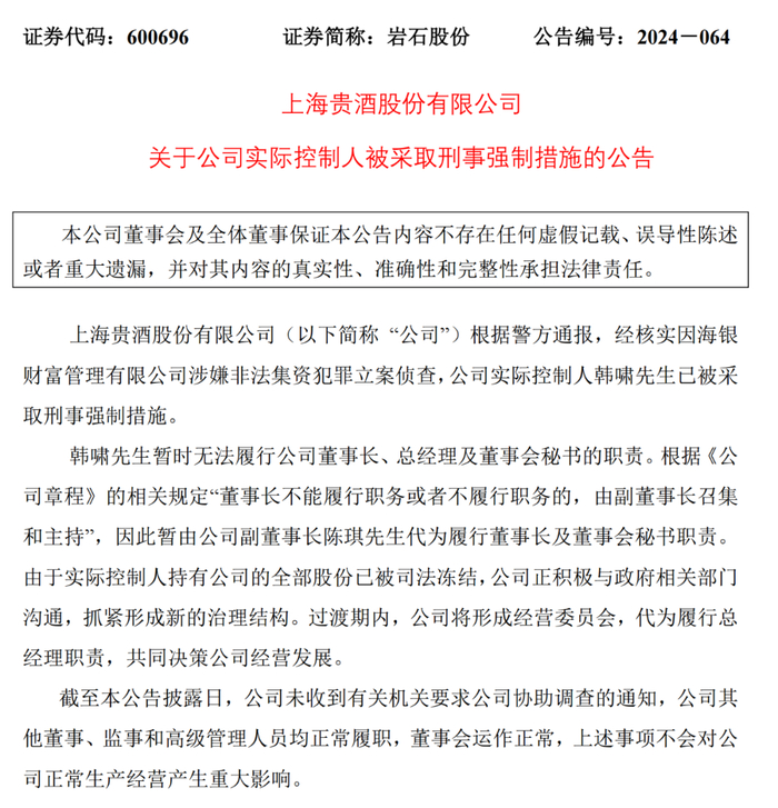 9月11日晚,岩石股份发布公告称,根据警方通报,经核实因海银财富管理有限公司涉嫌非法集资犯罪立案侦查,公司实际控制人韩啸先生已被采取刑事强制措施。