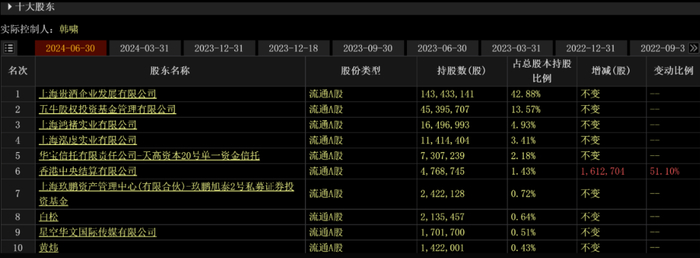 上海贵酒是岩石股份第一大股东,持股比例为42.88%。岩石股份第二、三、四大股东分别是五牛股权投资基金管理有限公司、上海鸿褚实业有限公司、上海泓虔实业有限公司,这三家公司连同上海贵酒,构成了一致行动人。