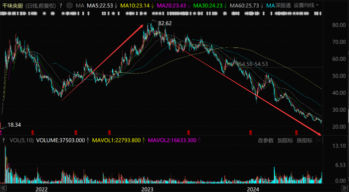 接下来,千味央厨就是单边下跌的走势,在过去一年半左右的时间里又从80多元跌到了20元出头,跌幅高达75%。