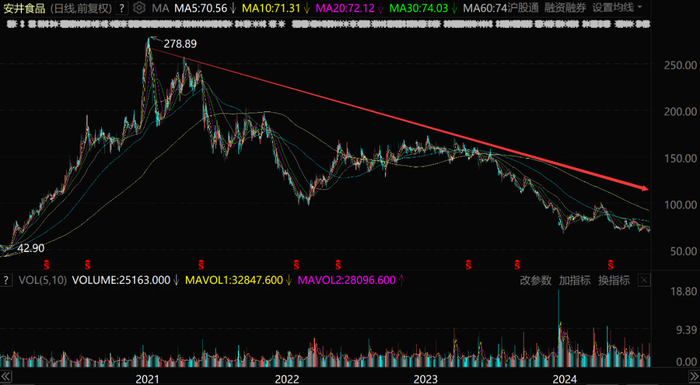 尽管股价从278元跌到了目前的71元附近,每股蒸发超过200元,但安井食品依然有200亿以上的市值,在一众预制菜概念股里算是出类拔萃了。